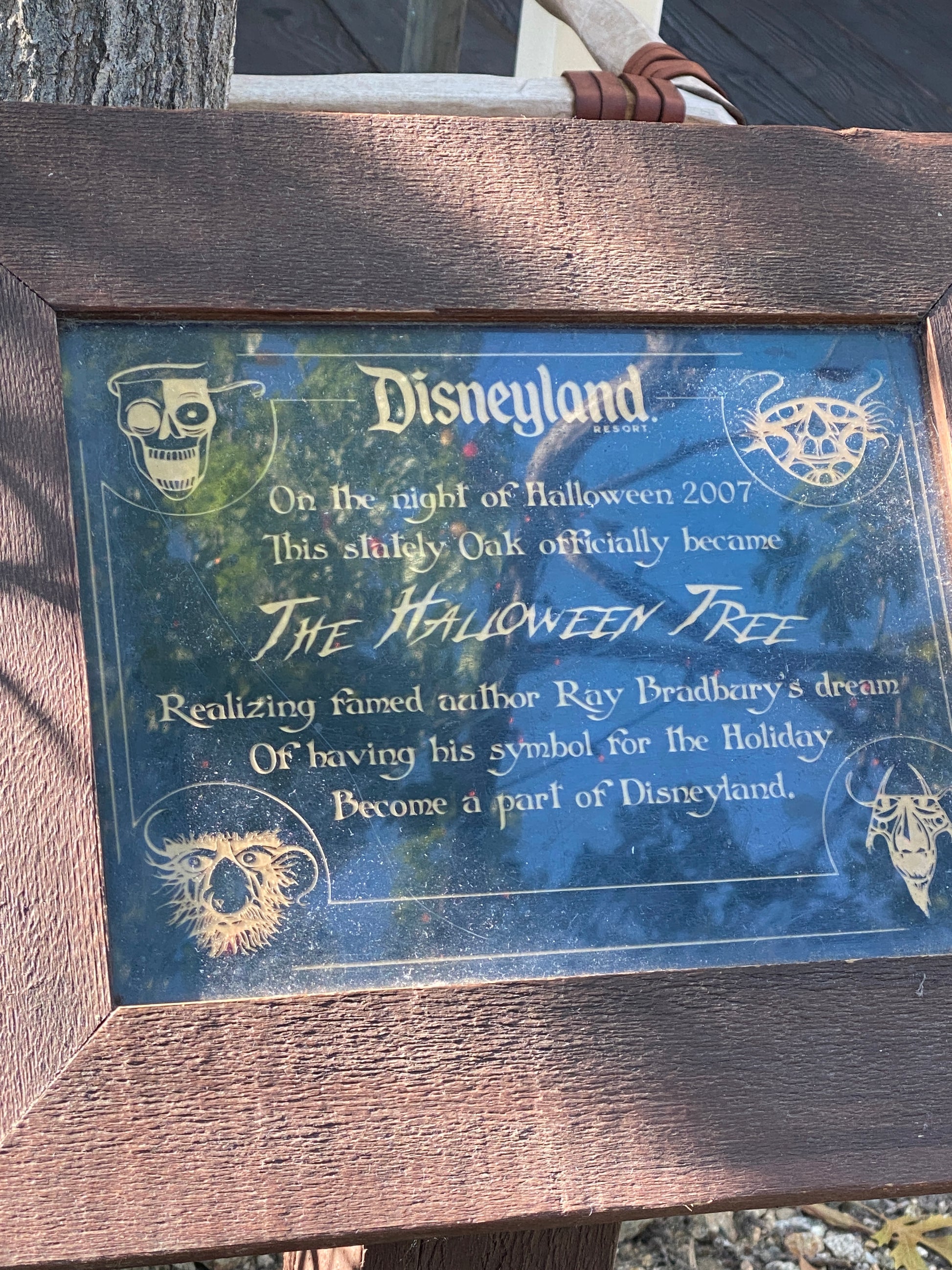 Ray Bradbury was an American author who wrote a fantasy novel called "The Halloween Tree." It's a short story about a group of boys who discover the origins of the Halloween holiday. Ray Bradbury and Walt Disney were actually great friends. In honor of their friendship, and the namesake book, an actual Halloween Tree was created in 2007 - since then it illuminates Frontierland at Disneyland every fall season.